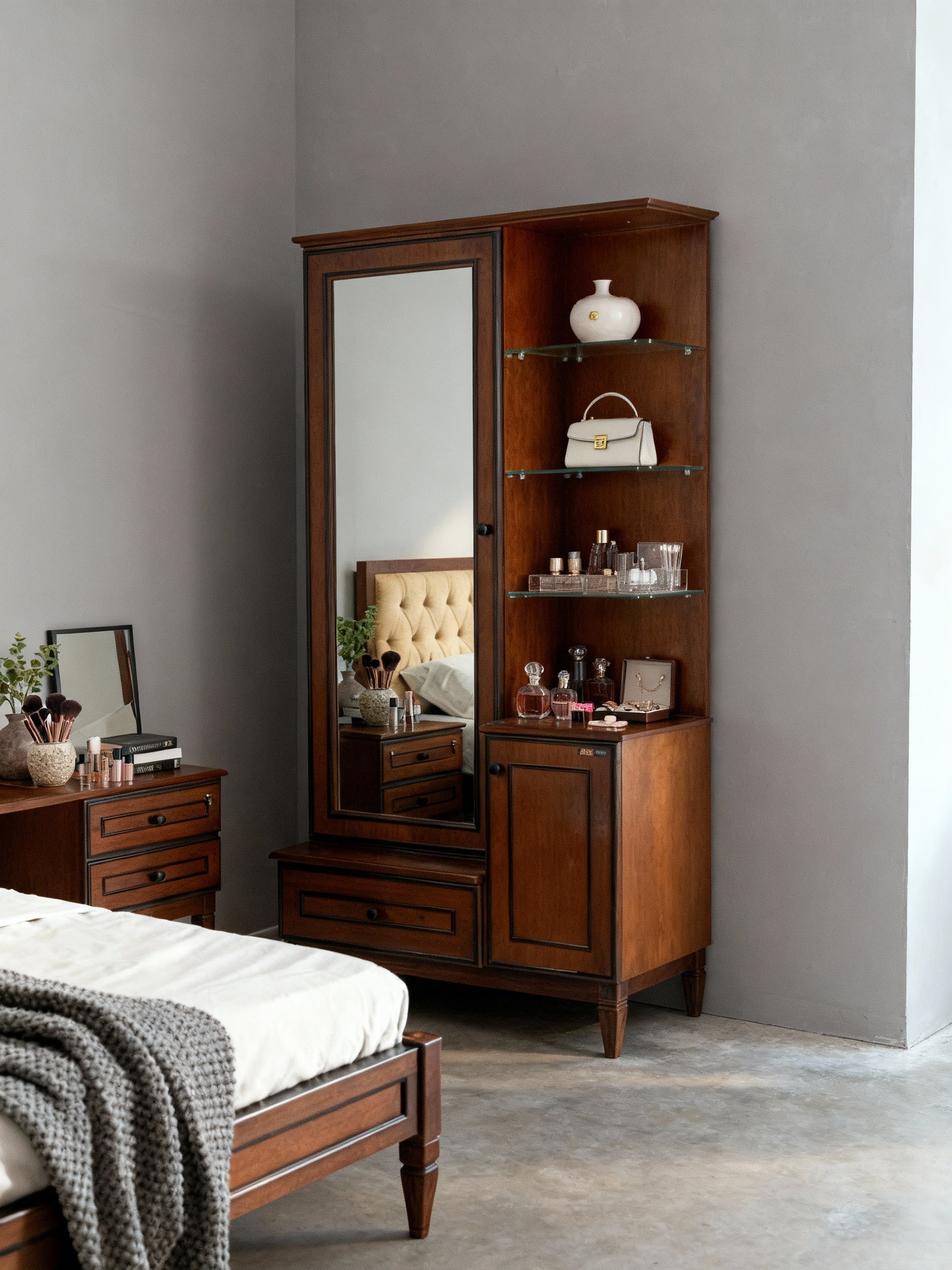 Includes: King Bed + 2 Door Cupboard + Chest of Drawers + Dressing Table + Bedside Cabinet