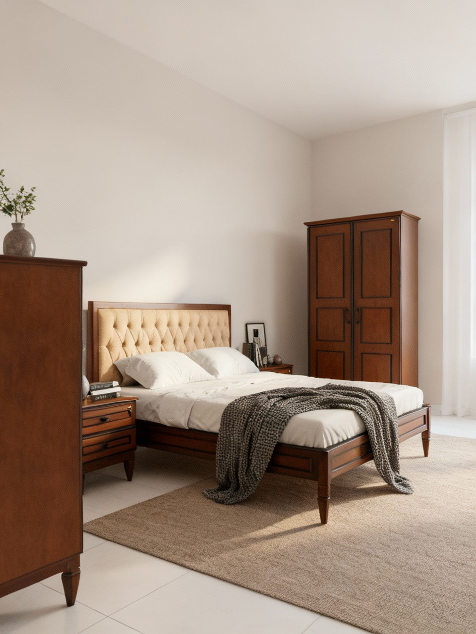 Includes: Queen Bed + 2 Door Cupboard + Chest of Drawers + Dressing Table + Bedside Cabinet